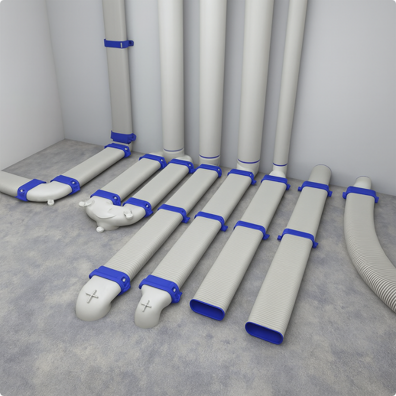 Het Renson EasyFlex systeem is een kunststof ventilatiekanaal dat ideaal is voor compacte inbouw achter plafonds, in muren of zelfs in de vloer. Dankzij de ovale vorm neemt het weinig ruimte in en blijft de luchtstroom optimaal. De kanalen zijn luchtdicht (klasse D) en voorzien van een glad, stofwerend en antibacterieel binnenoppervlak, waardoor vuil zich minder snel ophoopt.